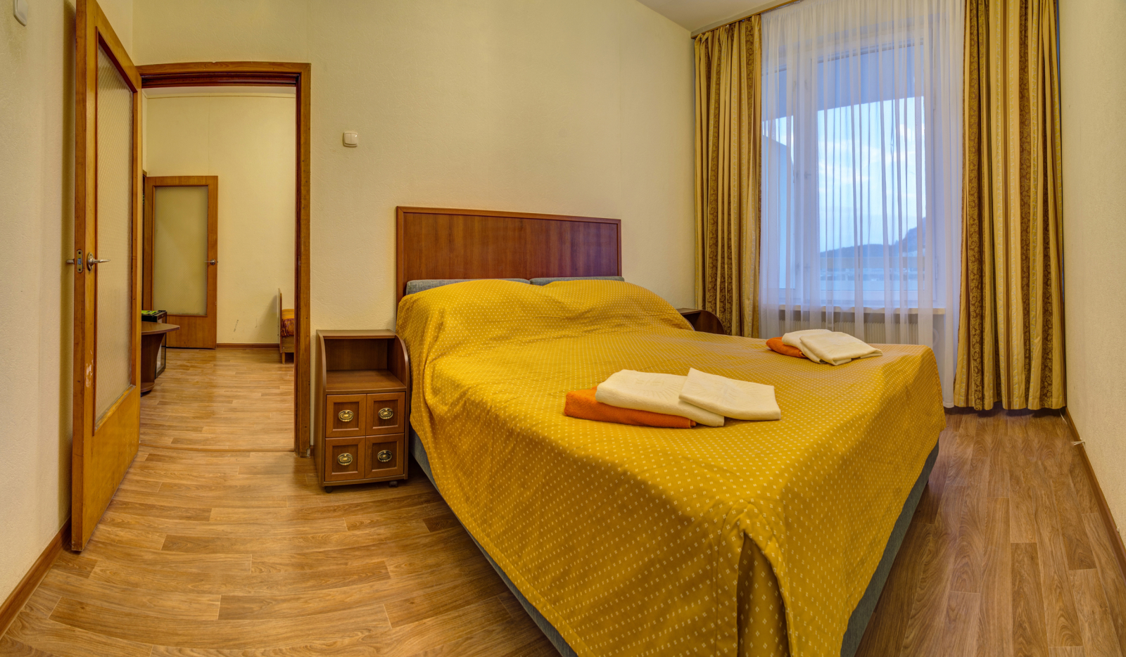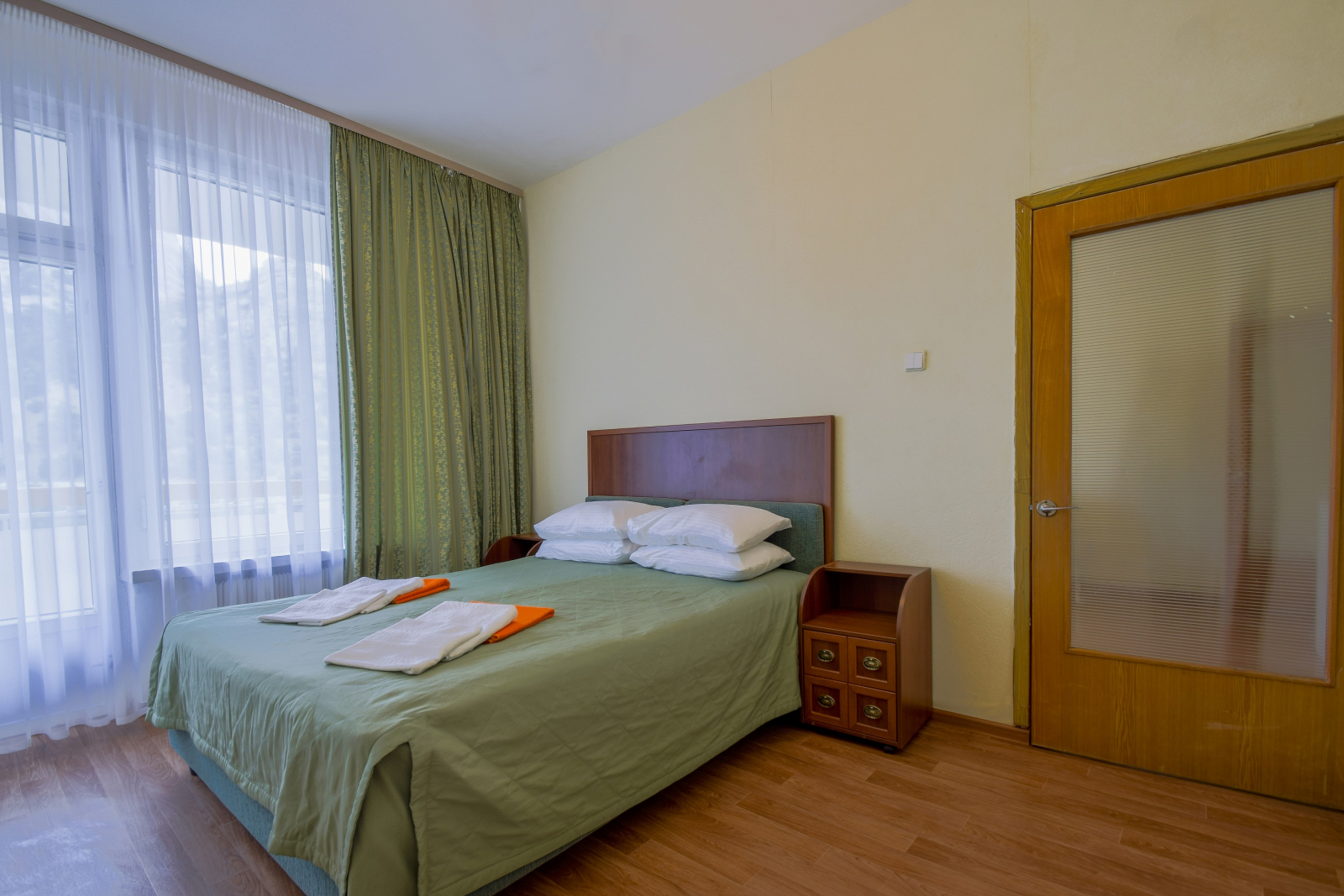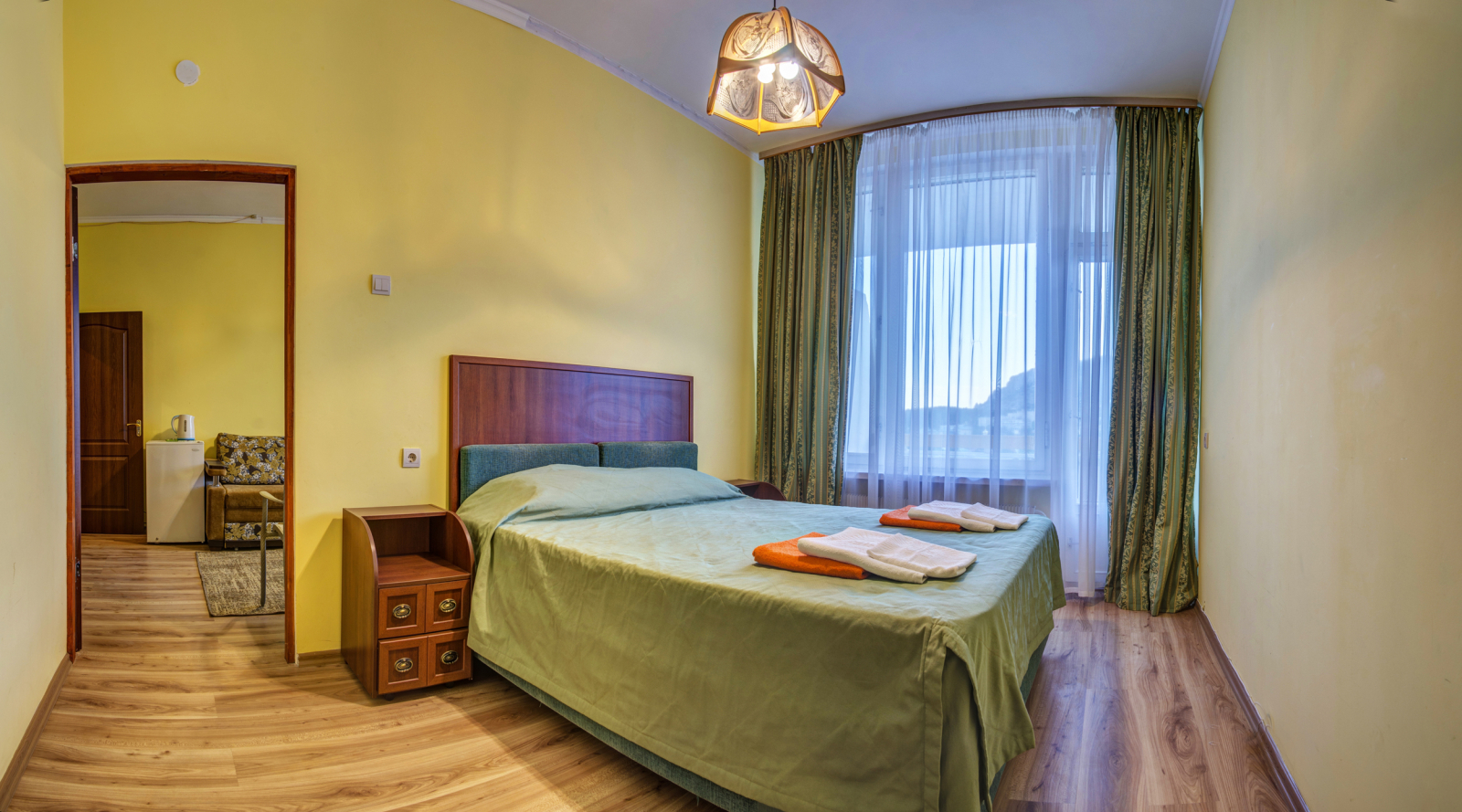 Площадь номера - 30-33 кв.м. 2 осн. места. 2 доп. места. Балкон. Мебель: вешалка, диван, зеркало, кровати односпальные /одна двуспальная кровать, прикроватные тумбочки, столик журнальный, стулья, шкаф встроенный. Оборудование: кондиционер, мини-холодильник, телевизор ЖК, чайный набор посуды, электрочайник. Санузел: с душем, туалетные принадлежности. Сервис: Wi-Fi бесплатно, смена полотенец (по требованию или 1 раз в 3 дня), смена постельного белья (1 раз в 5 дней), уборка номера (ежедневно).