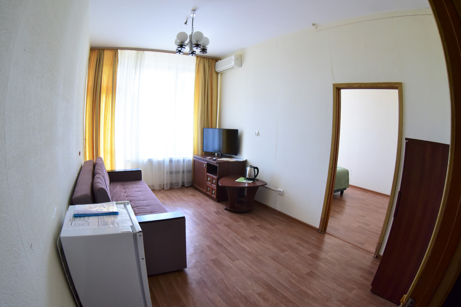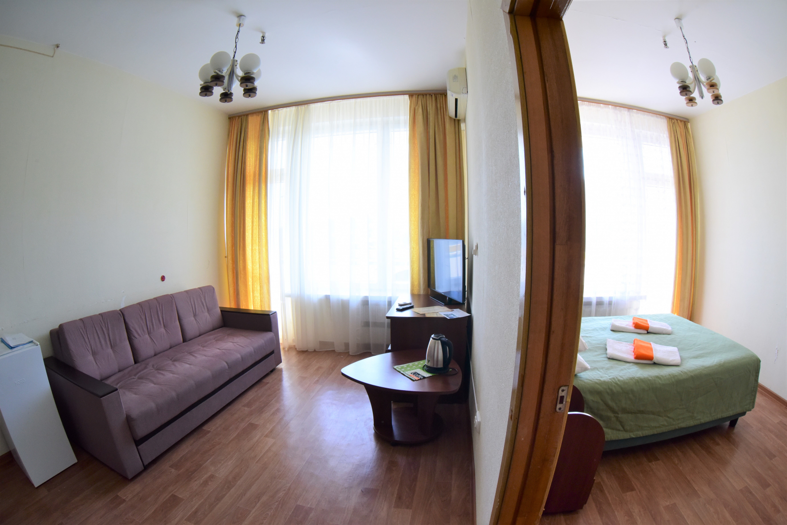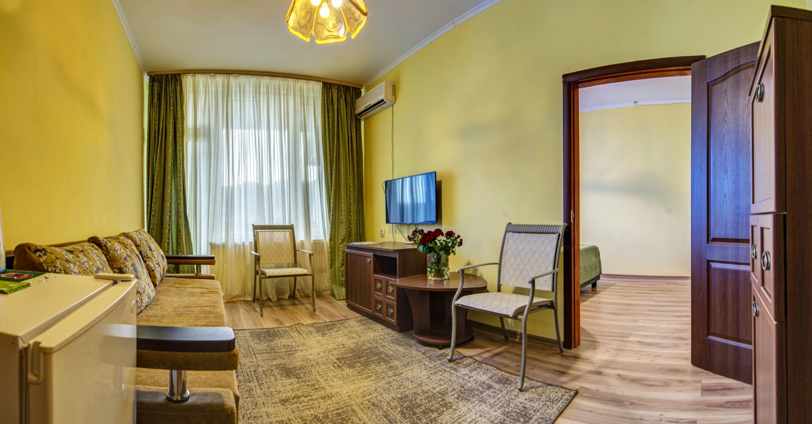 Площадь номера - 30-33 кв.м. 2 осн. места. 2 доп. места. Балкон. Мебель: вешалка, диван, зеркало, кровати односпальные /одна двуспальная кровать, прикроватные тумбочки, столик журнальный, стулья, шкаф встроенный. Оборудование: кондиционер, мини-холодильник, телевизор ЖК, чайный набор посуды, электрочайник. Санузел: с душем, туалетные принадлежности. Сервис: Wi-Fi бесплатно, смена полотенец (по требованию или 1 раз в 3 дня), смена постельного белья (1 раз в 5 дней), уборка номера (ежедневно).