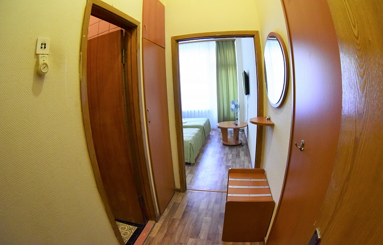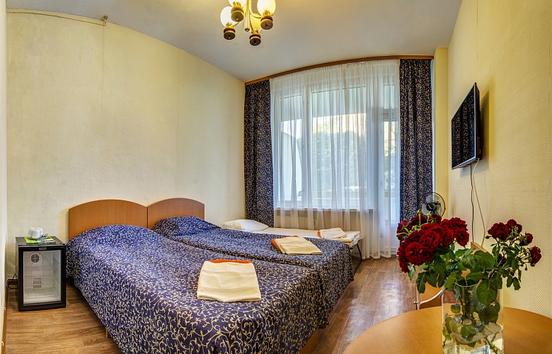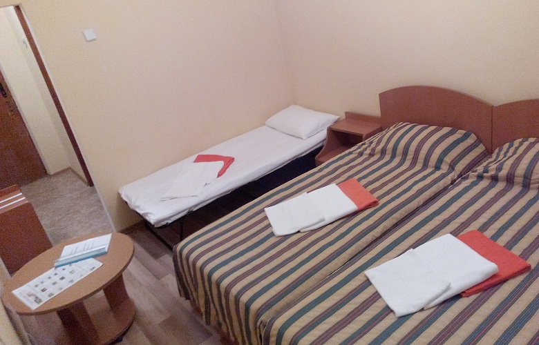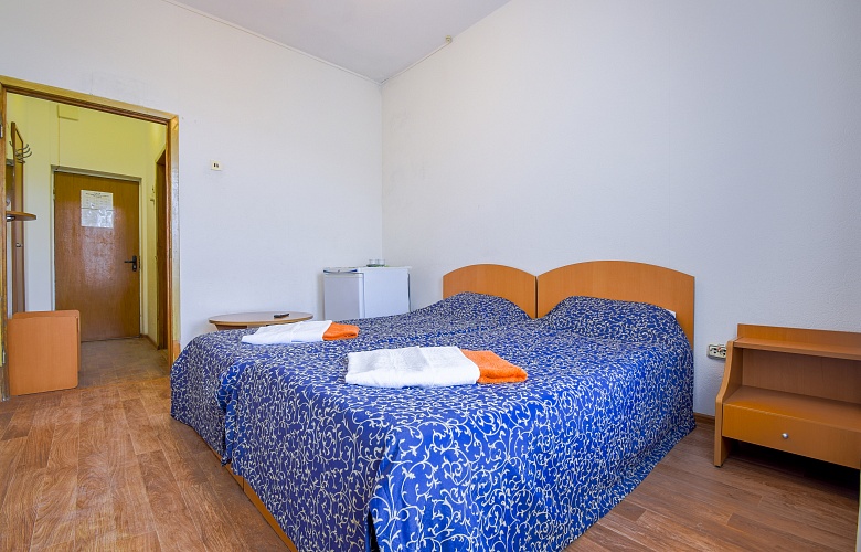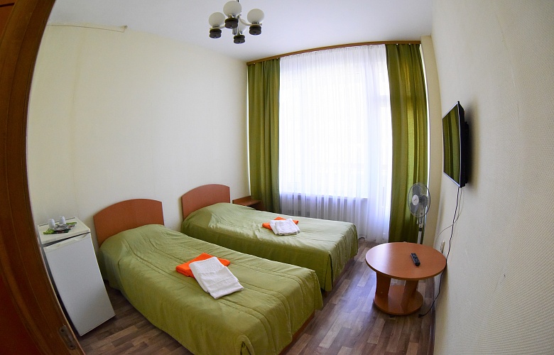 Площадь номера - 15 кв.м. 2 осн. места. 1 доп. место. Балкон. Мебель: вешалка, зеркало, кровати односпальные, прикроватные тумбочки, стол, стулья, шкаф. Оборудование: вентилятор, мини-холодильник, набор посуды, телевизор ЖК. Санузел: с душем, туалетные принадлежности. Сервис: Wi-Fi бесплатно, смена полотенец (по требованию или 1 раз в 3 дня), смена постельного белья (1 раз в 5 дней), уборка номера (ежедневно).